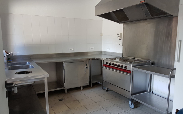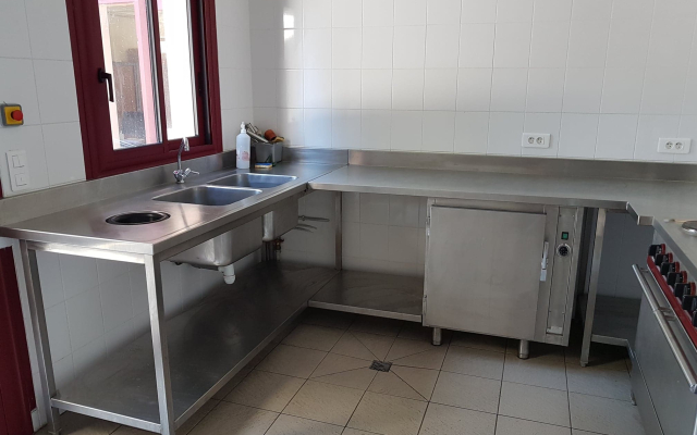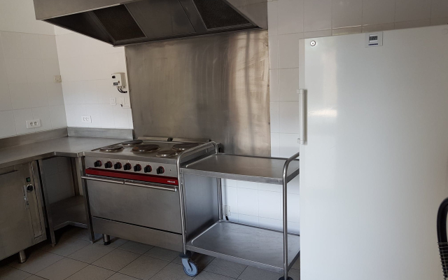 La cuisine est équipée : d’un grand frigo (largeur intérieure 60cm), d’un réchauffe-plat électrique, d’une gazinière électrique avec grand four, d’une hotte aspirante et d’un micro-onde. Il n’y a pas de congélateur, ni de vaisselle.